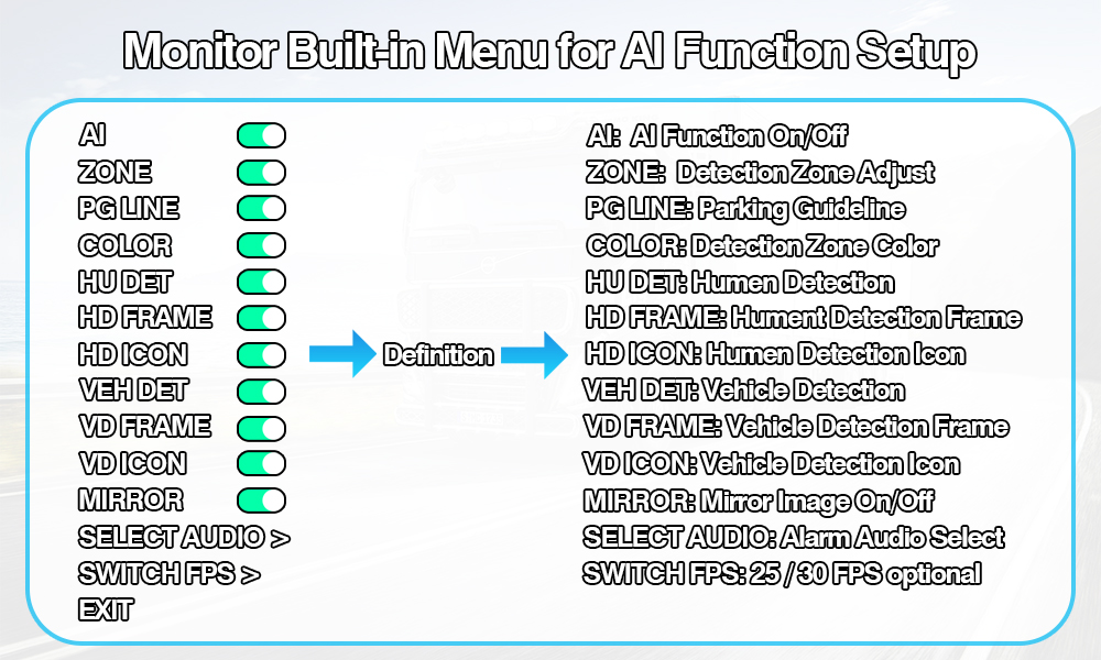एआई ब्लाइन्ड स्पट डिटेक्शन रियर भ्यू क्यामेरा बिल्ट-इन कलर चेन्जिङ लाइटएआई ब्लाइन्ड स्पट डिटेक्शन क्यामेरा प्रणाली बिल्ट-इन कलर परिवर्तन गर्ने चेतावनी लाइट एक बुद्धिमान वाहन सुरक्षा सेट हो जसमा एआई क्यालिब्रेसन सेटिङलाई समर्थन गर्ने एआई BSD क्यामेरा र एआई मोनिटर समावेश छ, प्रयोगकर्तालाई एआई सेटिङहरू परिवर्तन गर्न अनुमति दिन्छ, जस्तै पत्ता लगाउने क्षेत्र आकार समायोजन, अडियो अलार्म प्रकार चयन, पैदल यात्री पत्ता लगाउने / बन्द, सवारी साधन पत्ता लगाउने / बन्द / अन्य कुनै पनि सेटिङ।