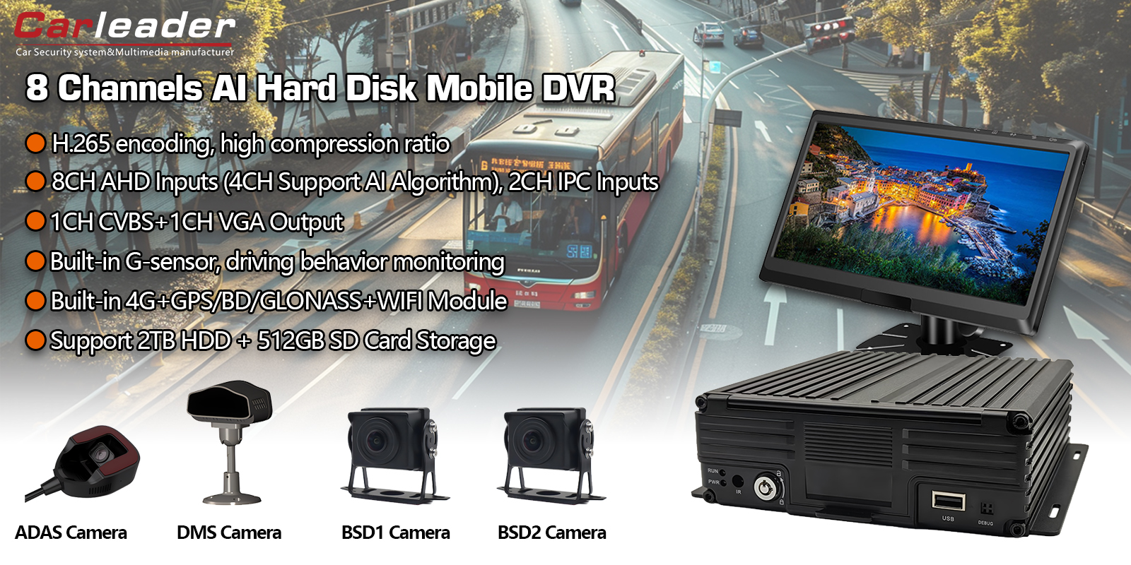 कारलिडर8CH AI HDD मोबाइल DVR समर्थन ADAS+DMS+BSDव्यावसायिक फ्लीट्स, सार्वजनिक यातायात, रसद, र आवश्यक विशेष सवारी साधनहरूको लागि उत्तम समाधान हो:
