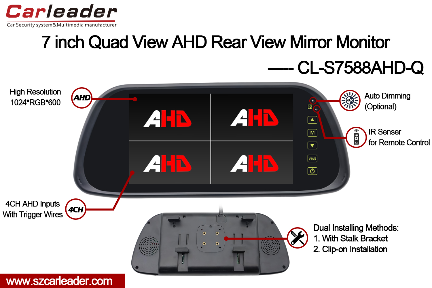 मा अपग्रेड गर्नुहोस्कारलिडर7 इन्च 4CH क्वाड AHD रियर भ्यू मिरर मनिटर समर्थन दोहोरो स्थापनासडकमा अतुलनीय दृश्यता, विश्वसनीयता, र मानसिक शान्तिको लागि।
