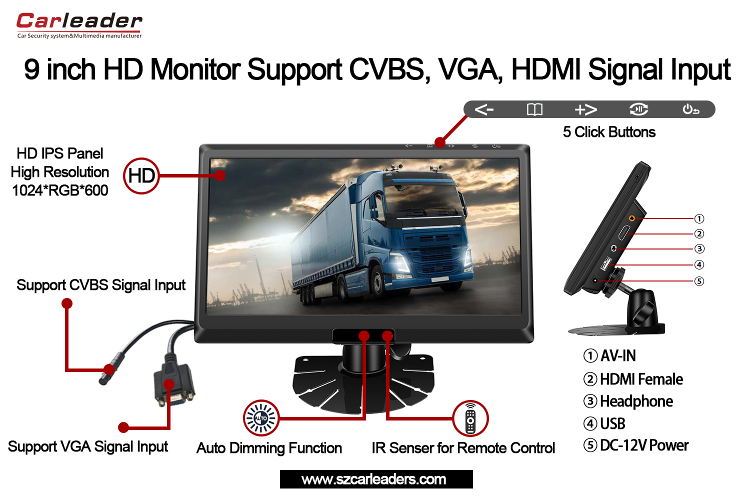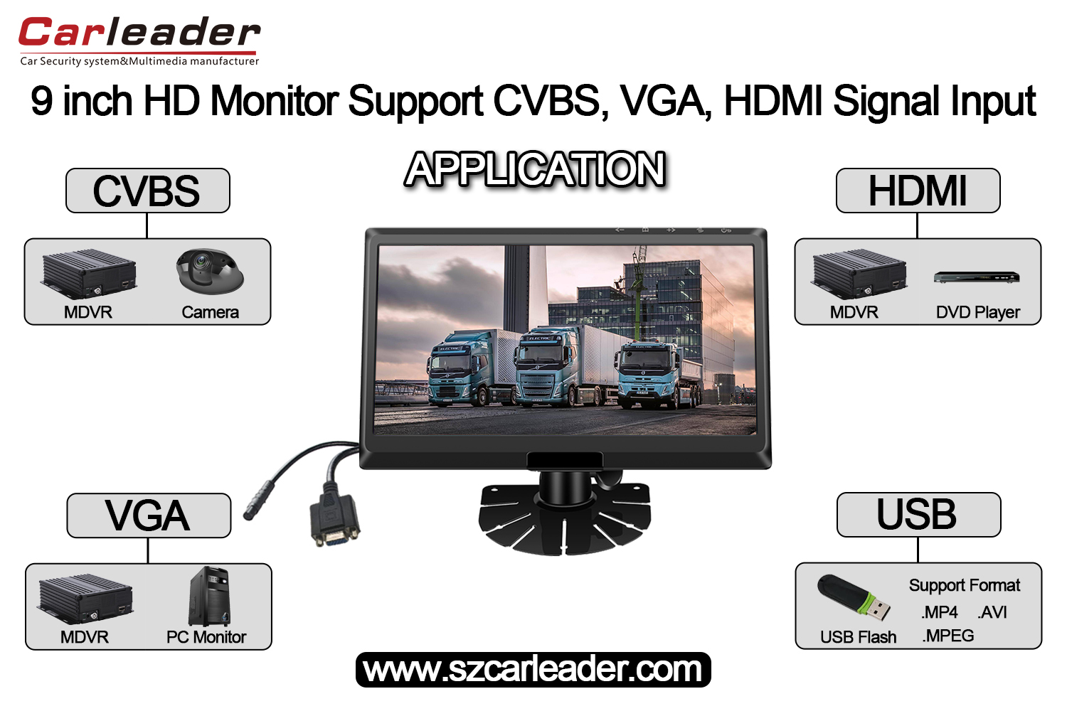कारलिडर९ इन्चको IPS स्क्रिन HD मनिटर सपोर्ट CVBS+HD+VGA इनपुटहरूवाहन निगरानी र MDVR फ्लीट व्यवस्थापनको लागि डिजाइन गरिएको एक उच्च प्रदर्शन HD मनिटर हो। कार मोनिटरले CVBS, HD र VGA सिग्नल इनपुटहरू समर्थन गर्दछ। र यदि MDVR सँग VGA वा HD इन्टरफेस छ भने, 9 इन्च IPS स्क्रिन कार मोनिटरसँग प्रयोग गर्न सकिन्छ।