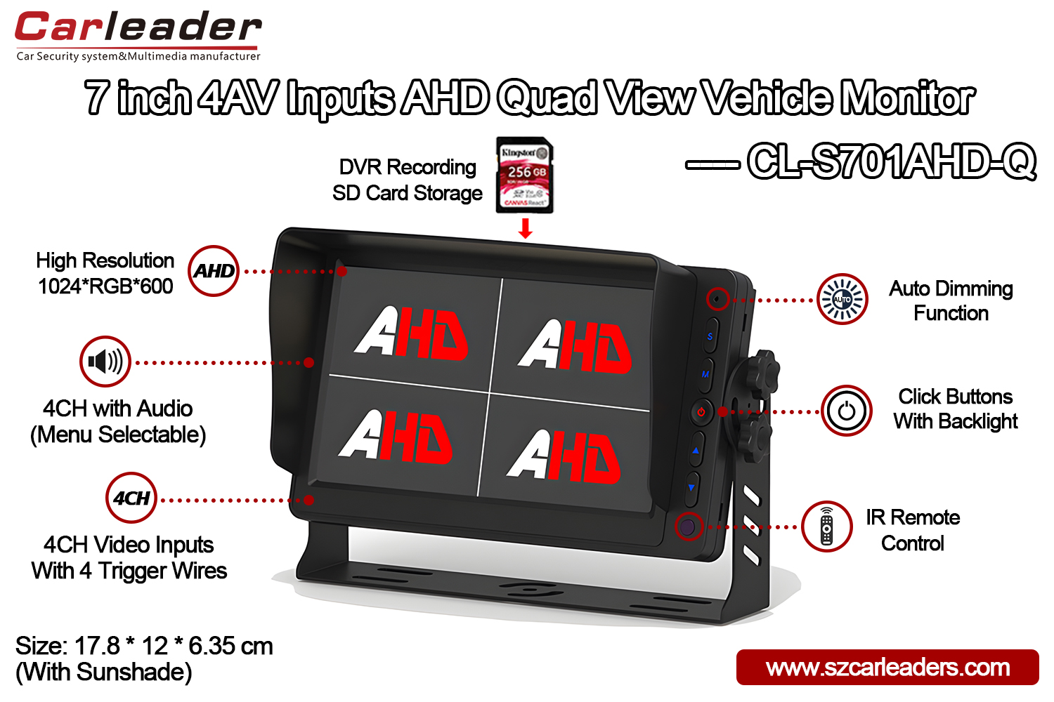 Carleader तपाईं हाम्रो प्रस्तुत गर्न गर्व छ7 इन्च 4CH AHD इनपुटहरू क्वाड दृश्य प्रदर्शन मनिटर, क्वाड भ्यू डिजाइनले गाडीको क्यामेराका लागि ४ च्यानलहरूलाई समर्थन गर्न सक्छ, जस्तै, अगाडिको दृश्य, साइड दृश्य x2, पछाडिको दृश्यले ठूला सवारी साधन (बस, ट्रक, र डेलिभरी भ्यान)का चालकहरूलाई सवारी चलाउँदा आफ्नो वरपरका धेरै दृश्यहरू निगरानी गर्न अनुमति दिन्छ।