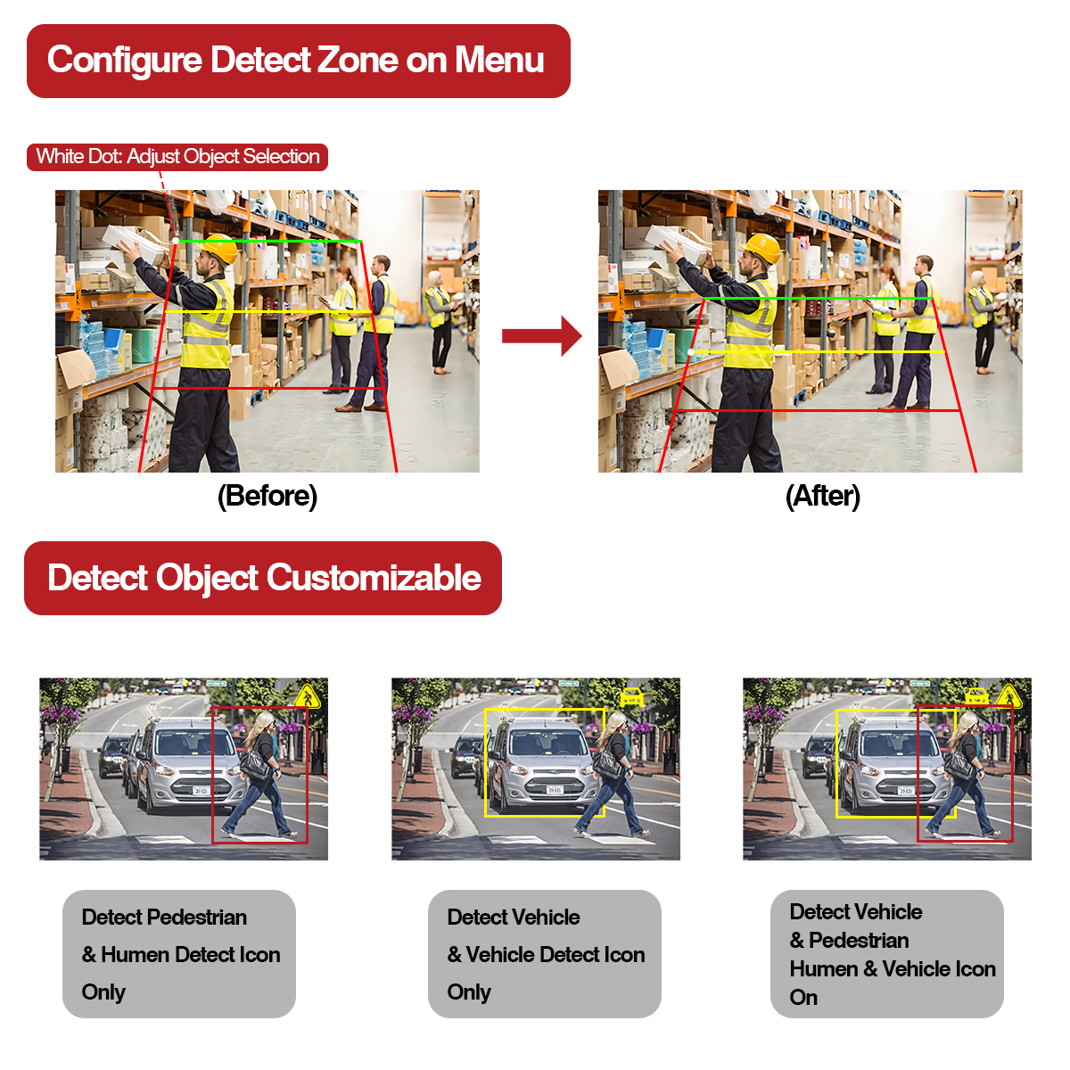 बिल्ट-इन चेतावनी प्रकाश प्रकार्यको साथ यो AI क्यामेरा, पत्ता लगाउने वस्तु फरक पत्ता लगाउने क्षेत्र (रातो, पहेँलो, हरियो) मा प्रवेश गर्दा प्रकाश रङ अनुरूप रङमा परिवर्तन हुनेछ। साथै तपाईंको गाडीको नजिक पुग्ने पैदल यात्रु र सवारी साधनलाई अलार्ममा अलार्मसँग एकीकृत गर्नुहोस्।