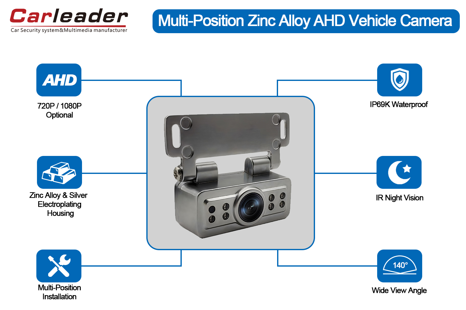 कारलिडरAHD सिल्भर इलेक्ट्रोप्लेटिंग वाहन रिभर्सिङ क्यामेरा, जस्ता मिश्र धातु आवास र चाँदी इलेक्ट्रोप्लेटिंग संग, १४० डिग्री चौडा दृश्य कोण र IP69K वाटरप्रूफ र डस्टप्रूफ। स्थापना कोण र स्थिति पनि स्क्रू द्वारा तय गर्न सकिन्छ।